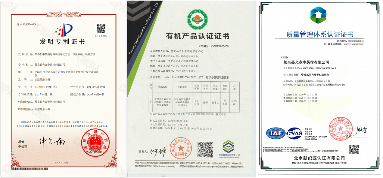 赞皇县光森中药材有限公司在国内有三大优势是其他公司无法比拟的,第一我公司采用世界最先进的酸枣仁全检设备,拥有多种实用新型专利证书,严格把控质量,是多家药企及饮片厂供应商。第二公司走的是品牌化战略,酸枣仁为中国有机产品认证,主打野山真品牌,力争把它打造成一个世界级的知名品牌。第三公司产品以药效好,营养高,天然健康为经营理念。随着现在人们生活快节奏以煮、泡等方式,已经不能适应现在的饮食习惯,我公司有多种产品推向市场,解决了酸枣仁即饮即食,完整保留了酸枣仁的天然药效、营养成分,帮助人们增加营养提高免疫力,改善睡眠质量,这也预示着公司产品销售额可以做到无限大。
